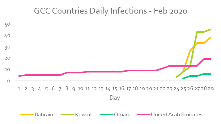The infections however continued to grow yet captured at ports of entry but remained at low rates in the GCC in January and most of February. Iran registered its first cases on the 20th of February which kept rising expectantly. Such fast-viral spread led many of the GCC nationals who were spending holiday time in the country to return and cause the first cases (aside from those registered in UAE).
