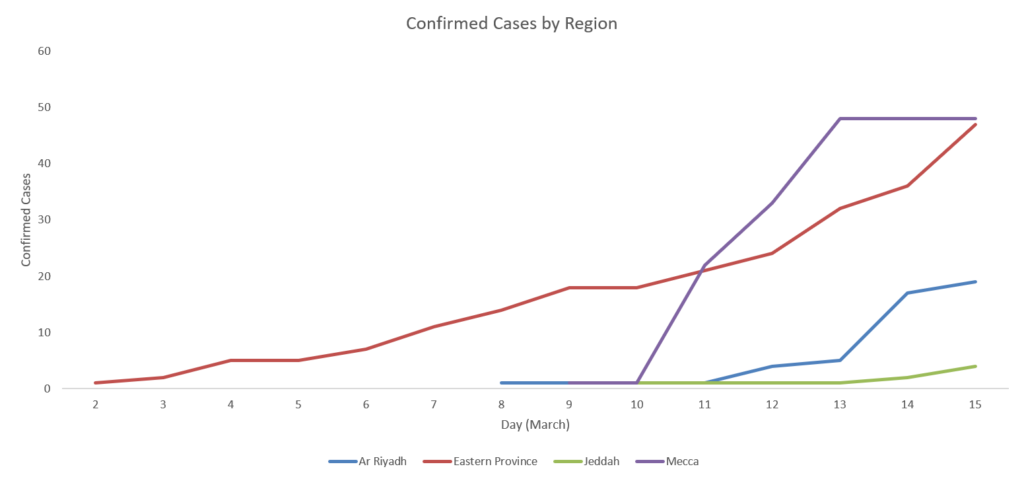 Saudi Arabia registered the first case on the 2nd of March. A Saudi national from the Qatif (a city in the Eastern Region) was returning from Iran through Bahrain. Qatif registered rapid community spread that led the Saudi government to take swift measures such as suspending schools on the 7th of March and then isolating the city on the 9th. The Saudi government took additional precautionary measures prior to the first case starting from late February. The government suspended the use of the national ID for entry on the 28th of February and then suspended issuing new Umrah and other types of visas to countries with high infection rates on the 29th of February. The Kingdom registered a total of 118 cases by the 15th of March that are mainly located in the Eastern Region and Mecca region.