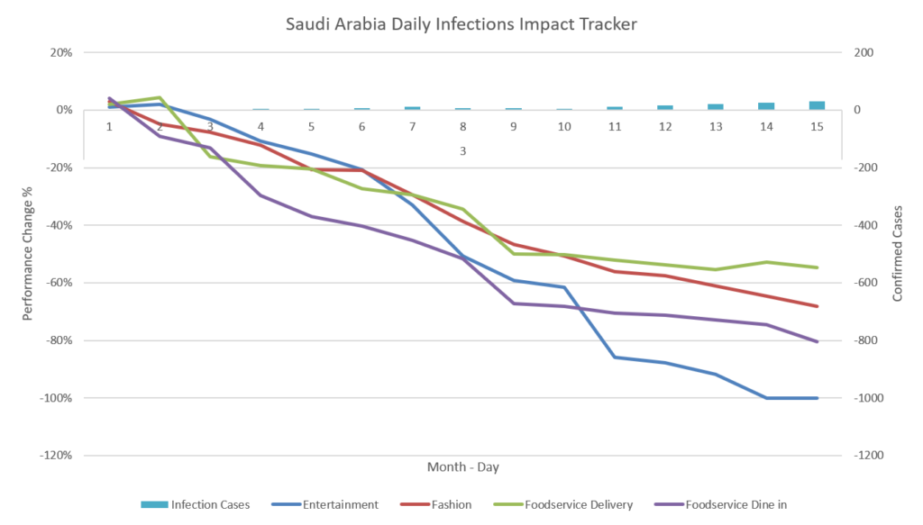 The early impact witnessed in Mecca was also evident in Jeddah due to its proximity and utilization as a travel hub to the holy city. The foodservice dine-in witnessed a steep drop on the 8th of March as a result of Sheesha ban. Jeddah dine-in scene is strongly tied with sheesha due to its cosmopolitan culture. As for the fashion market, it registered a dip reaching -83% which is considered better than other cities such Riyadh and the Eastern region due to the presence of outdoor fashion retail. Fashion retailers were allowed to operate few more days after the March 15th decision to close retail malls. Fashion retail operations was reduced even further to prevent viral community spread.