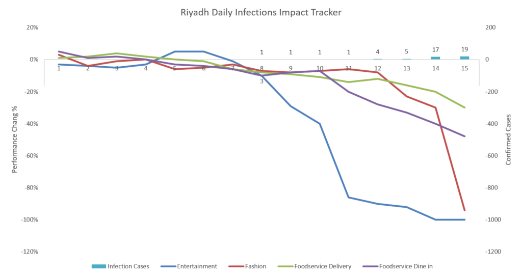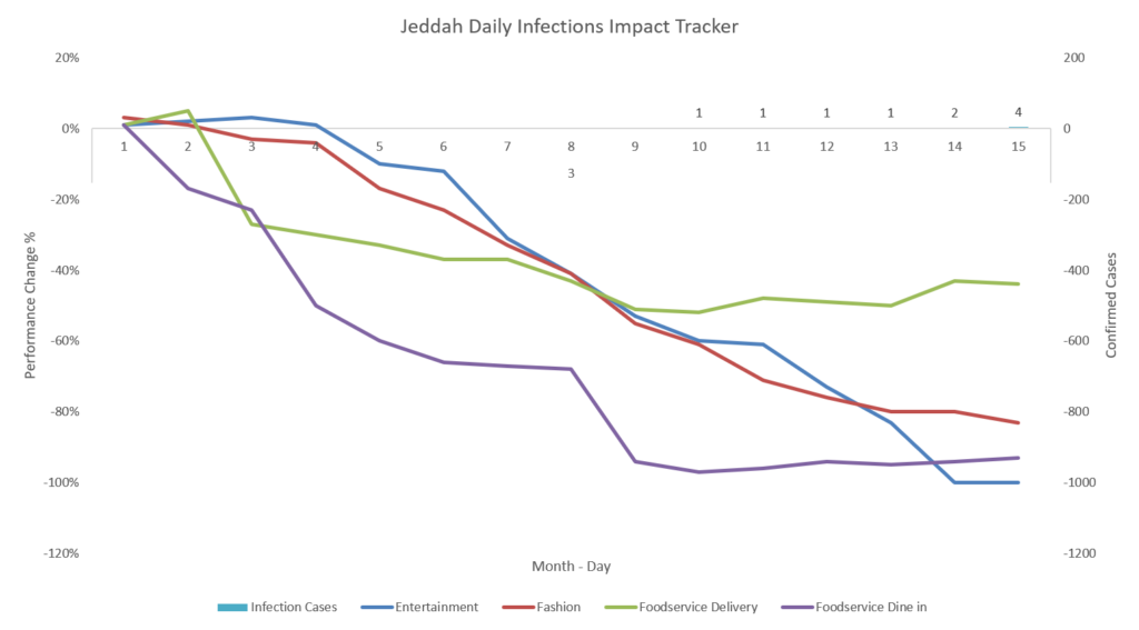 The impact of COVID-19 on Riyadh started late compared to the other regions where the Entertainment industry was shocked by the nationwide government ban on cinemas on the 11th of March which was then followed by the ban on family entertainment centers on the 14th of March which led to the 100% decline of performance in both cinemas and family entertainment centers on the 14th of March onwards. The foodservice and fashion slowly declined the growth performance since the first announcement of the first case to reach -48% for foodservice dine-in (takeout only), -94% for fashion, and -30% for foodservice delivery. According to the Royal Commission for Riyadh, the population in Riyadh reached 8.2 million people (Saudi Central Department for Statistics & Information 2017) which is the second highest in the country. The high population with strong disposable income in the city prevented the foodservice industry to collapse like the other cities in the country. Restrictions on fashion and the lack of a fashion retail presence in retail strips were the reason for the drastic drop in the industry from the 14th of March onwards.
