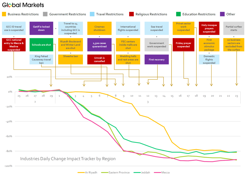 Despite the fact that Mecca did not register any cases until the 9th of March, the city however witnessed regional tourism and business restrictions that weakened consumer confidence which resulted in the first signs of market drop in the country. GCC nationals were barred from entering the holy city on the 29th of February, Umrah was suspended on the 4th of March, the holy mosque was closed one hour after Isha prayers, and other city level business and trade restrictions were imposed in the first week of March. Cities in the Western Region such as Mecca and Jeddah operate more outdoor retail strips than other cities in the kingdom which impacted the fashion industry but not as much as the other regions where malls were shutdown.