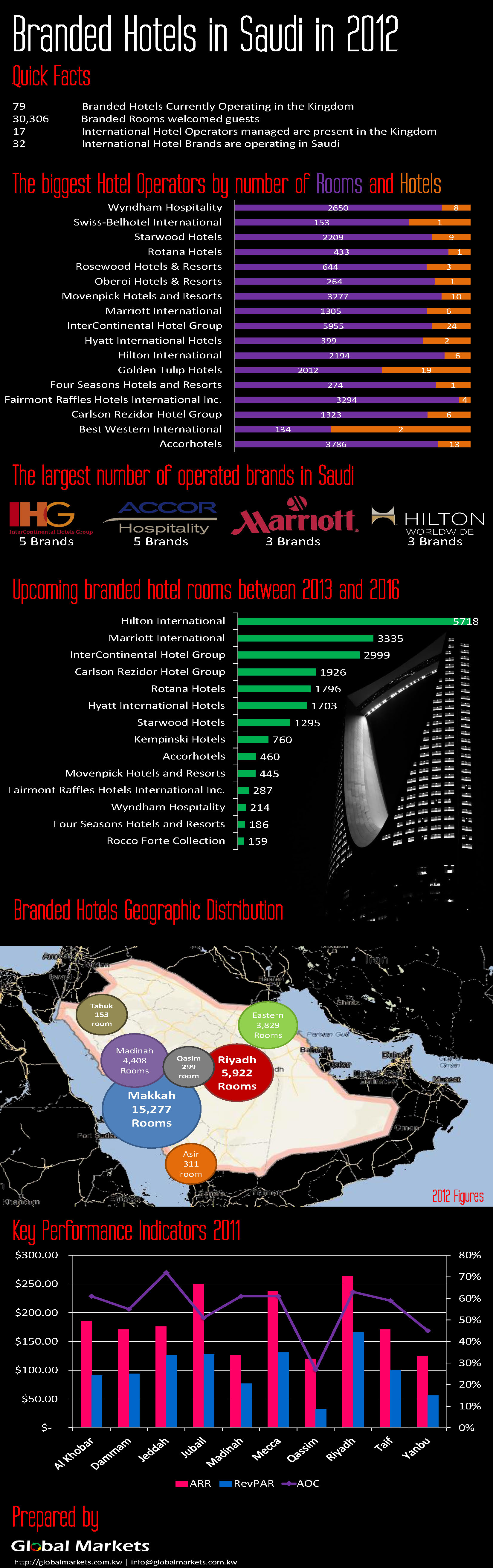 Global Markets is glad to announce infographics design as a new addition to our prime services. Infographics are intensive data and information sets offered to readers in an attractive presentation. Our first infographic is about branded hotels in the Kingdom of Saudi Arabia. The information focuses on the distribution and the availability of international brands and operators in the Kingdom.