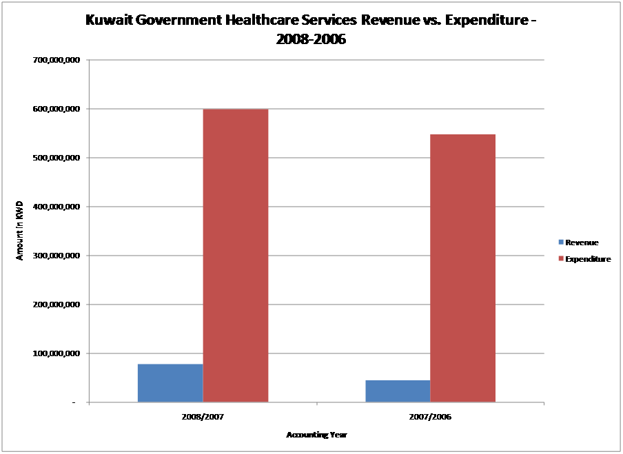 Kuwait’s wealth enabled it to provide free Healthcare to its local residents and collect minimal fees from expats. The Kuwaiti government also sends local citizens abroad for treatment if no applicable resources are available locally. The Healthcare system contributed 1.07% of the G.D.P. in 2008 which is relatively low among the other activities in country’s economy[1], Graph 3. The government of Kuwait spent a total of KWD 598,500,000 on healthcare in 2008/2007 which is a 9% increase from the 2007/2006 amount spent, KWD 547,200,000. On the other hand, the government generated a total of KWD 77,554,000 in 2008/2007 which is an increase in revenue by 74% compared to the previous year, Graph 4[2]. The increase in revenue is correlated with the increase in foreign population which is the main source of revenue.