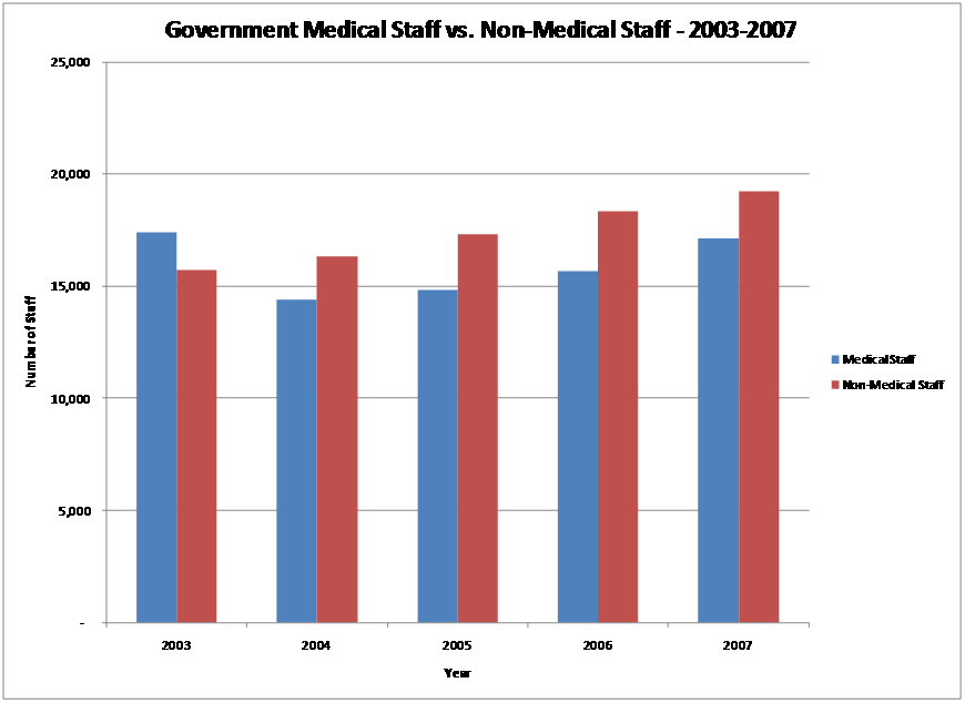 Kuwait government currently operates 15 general and specialized hospitals[4]. As of 2007, the government Healthcare system in Kuwait employed 36,377 employees. The number of medical staff (physicians, dentists, and nurses) is lower than the number of non-medical staff, Graph 4.