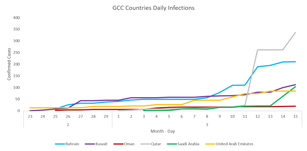 UAE registered the first cases in the GCC with four cases on the 29th of January followed by Kuwait three cases on the 24th of February. The cases started spreading in Kuwait, Saudi Arabia, Oman, and Bahrain in the last week of February and early March as a result of travelers returning from Iran.