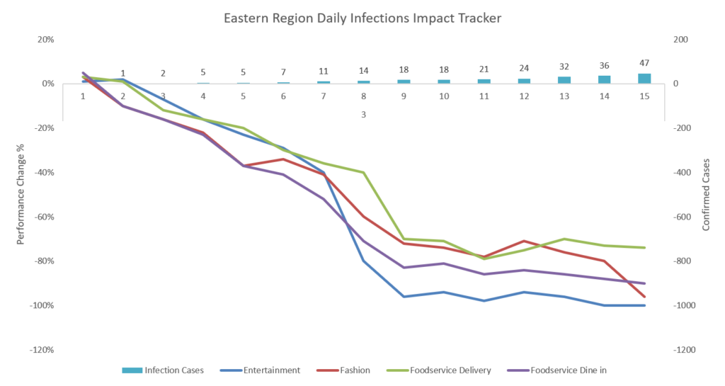 Being the first region to register an infection in the country followed by a community spread and a city lockdown within a week from infection caused the foodservice, fashion, and entertainment industries to plunge to -36% drop in performance revenue for foodservice delivery, -52% for foodservice dine-in, -40% for entertainment, and -41% for fashion. The nationwide government measures which started on the 11th caused the four markets to drop to the second lowest levels in the country. The continued lockdown in Qatif and the general negative consumer sentiment are keeping the revenue performances in the Eastern Region lower than other regions in the kingdom.