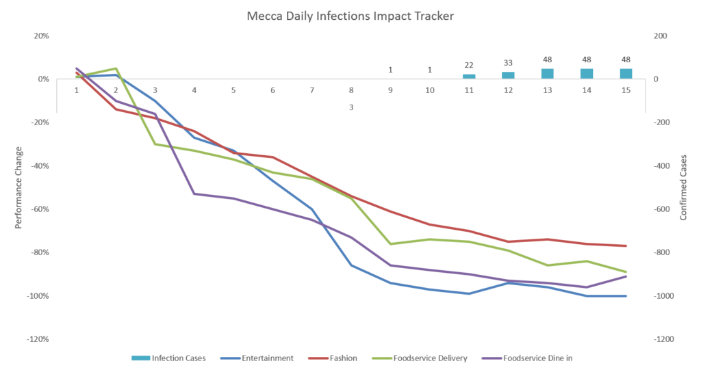 Despite the fact that Mecca did not register any cases until the 9th of March, the city however witnessed regional tourism and business restrictions that weakened consumer confidence which resulted in the first signs of market drop in the country. GCC nationals were barred from entering the holy city on the 29th of February, Umrah was suspended on the 4th of March, the holy mosque was closed one hour after Isha prayers, and other city level business and trade restrictions were imposed in the first week of March. Cities in the Western Region such as Mecca and Jeddah operate more outdoor retail strips than other cities in the kingdom which impacted the fashion industry but not as much as the other regions where malls were shutdown.